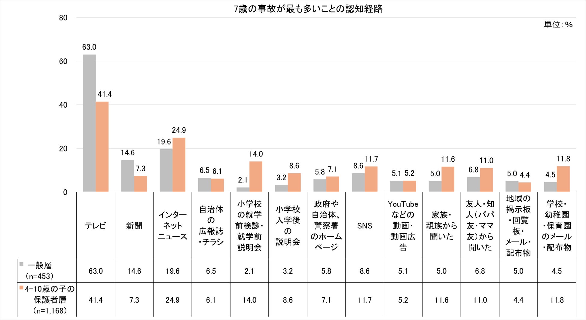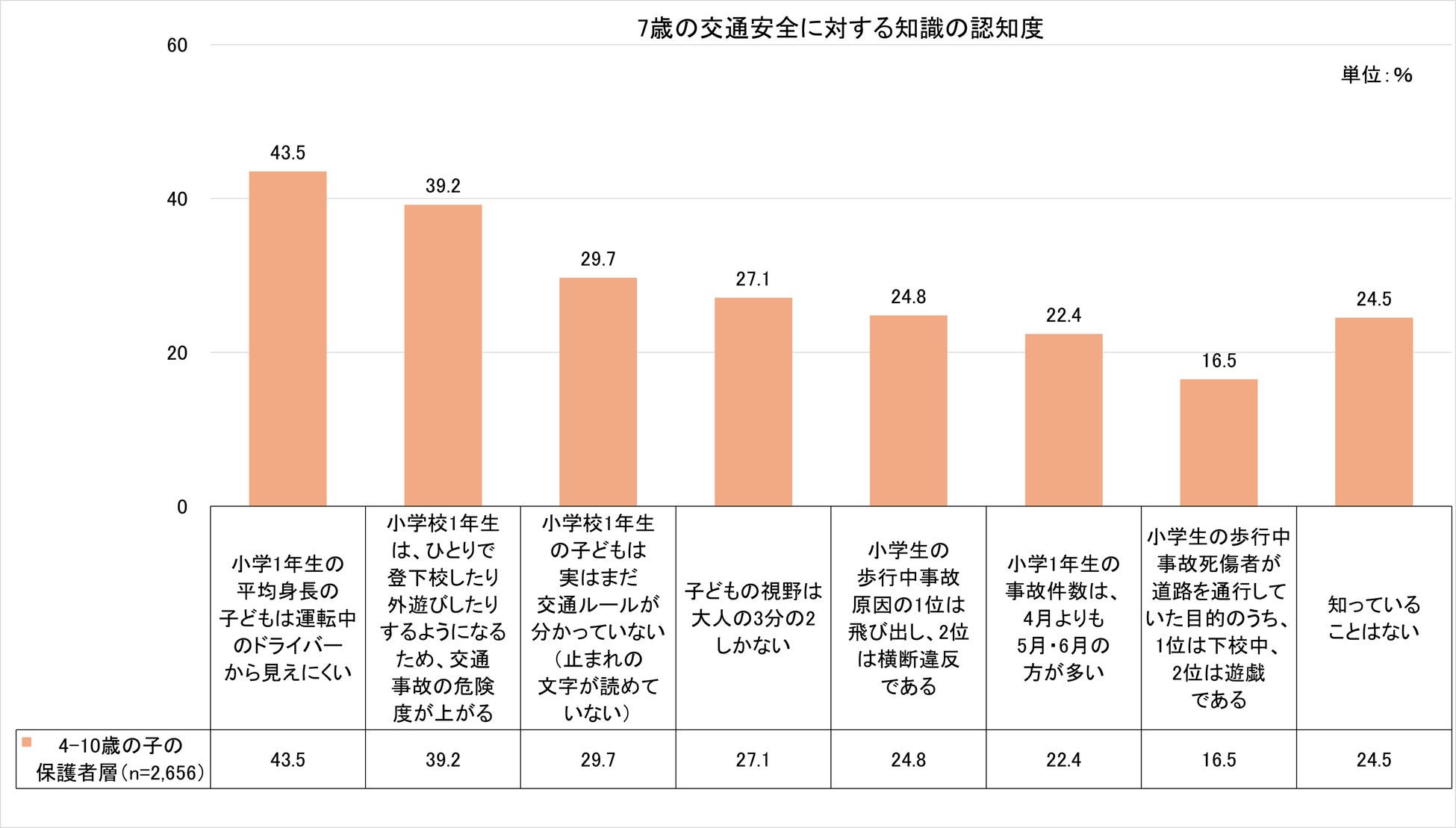 7歳の事故が最も多いことは一般層で31.4%、4-10歳の子の保護者でも44.0%と、半数以上はこの事実を知らない。