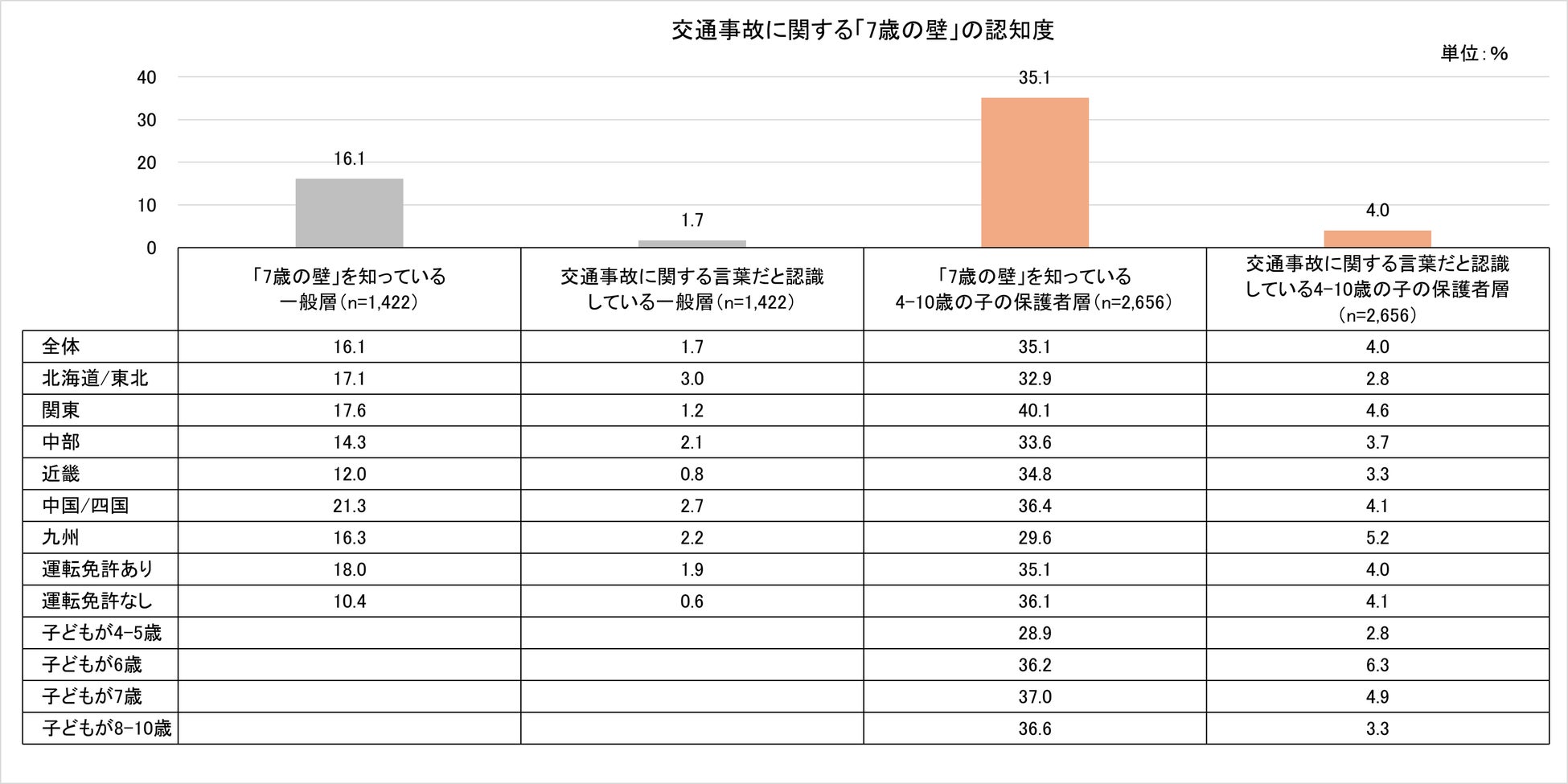 「魔の7歳」を交通事故の事象として認知しているのは、一般層で6.7%、4-10歳の子の保護者でも10.5%にとどまる。「7歳の壁」は、一般層で1.7%、4-10歳の子の保護者でも4.0%の認知に限られる。