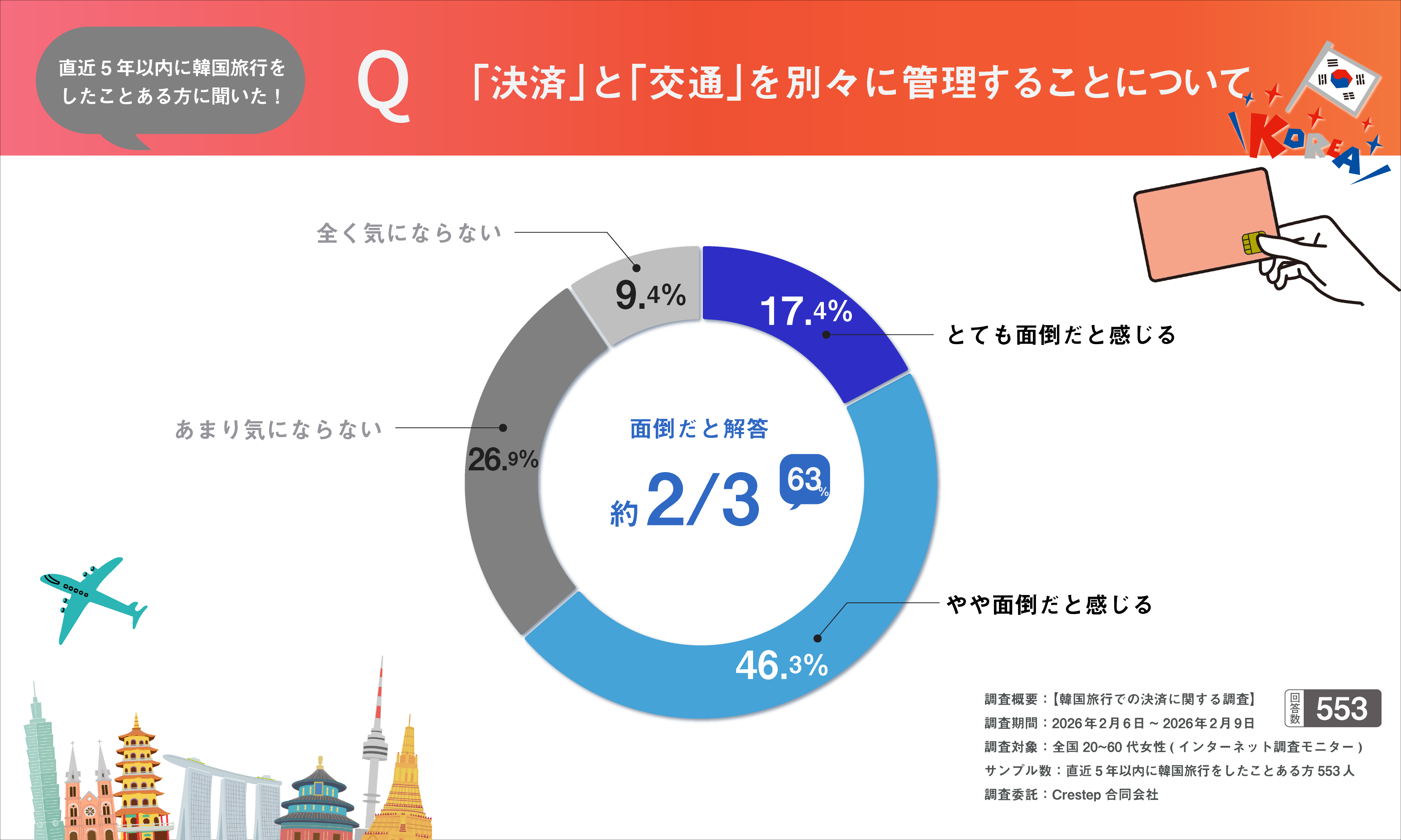 韓国旅行では、「クレジットカード」「現金」「交通カード(T-moneyなど)」といった複数の支払い手段を使い分ける必要があります。今回の調査で決済や交通を別々に分けることに関して、全体の約63%が「面倒」と回答しました。