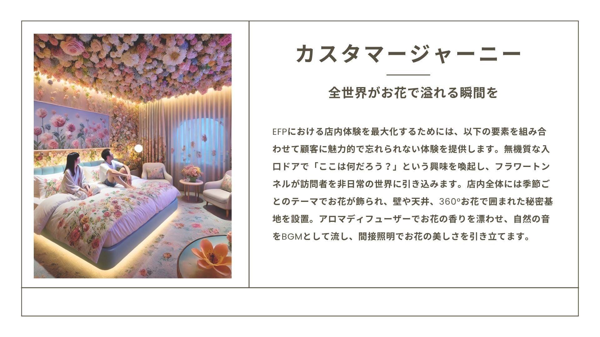 EFPは、街全体、世界全体を一つのフラワーパークに見立て、訪れる人々が五感で花の物語に触れる世界を目指します。