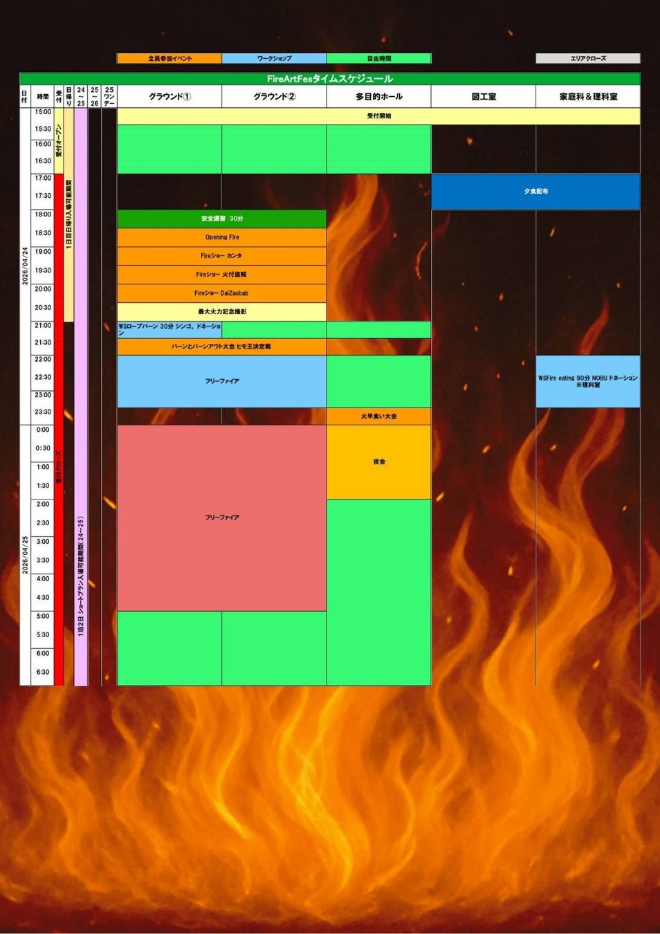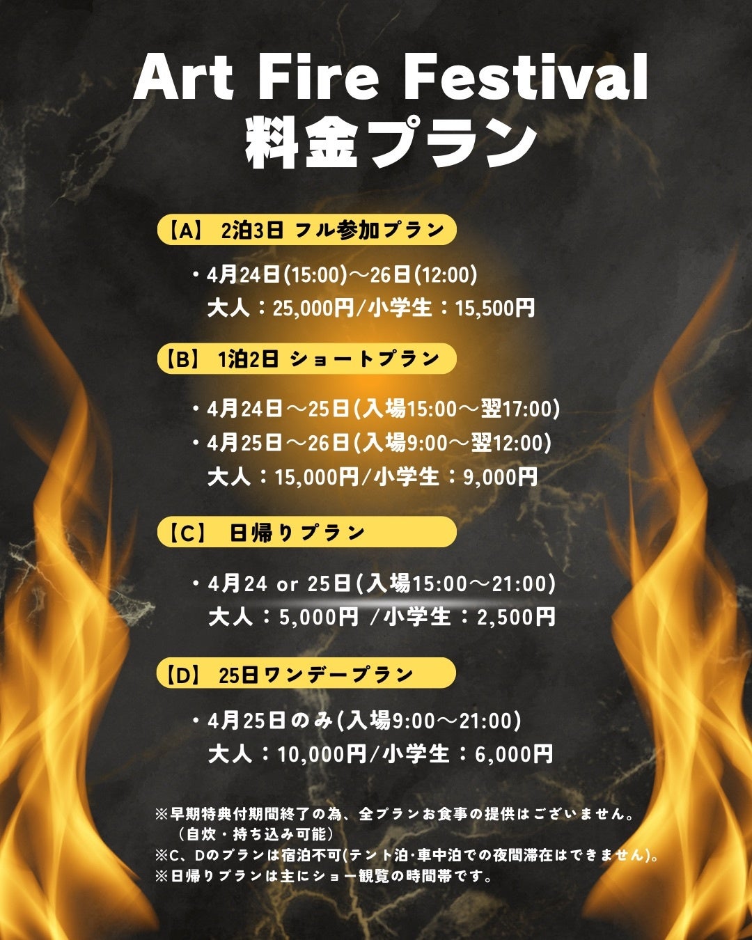 しかし、チケット発売直後より「宿泊はできないが、昼間のワークショップにも参加したい」「日帰りでも朝から夜までガッツリ炎のフェスを楽しみたい」という熱いご要望を多数いただいたため、急遽、4月25日(土)の朝から夜まで全コンテンツを日帰りで体験できる「ワンデープラン」を新設することといたしました。