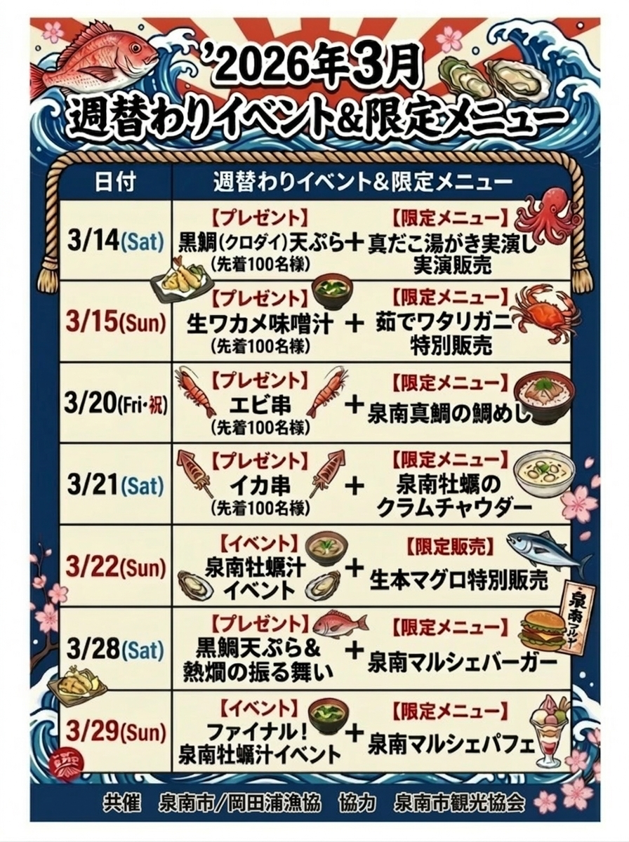 内容:日替わりテーマ(麺類/スープ類/鉄板焼き類)のキッチンカー出店、キッズエリア、スイーツ販売、泉南牡蠣まつり同時開催