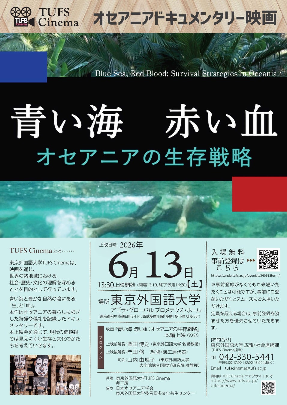 東京外国語大学(東京都府中市、学長:春名展生)は、2026年6月13日(土)、TUFS Cinemaにおいて映画『青い海・赤い血:オセアニアの生存戦略』の上映会を開催いたします。