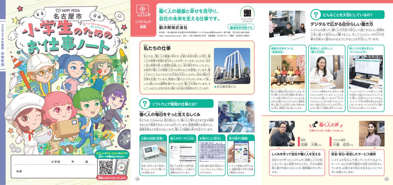 勤次郎株式会社(本社:東京都千代田区、社長:加村 光造)は、文部科学省が推進するキャリア教育のための副教材2026年度版「小学生のためのお仕事ノート(名古屋市版)」に協賛しましたことをお知らせします。IT業界の仕事について、当社を題材としてわかりやすく紹介されています。