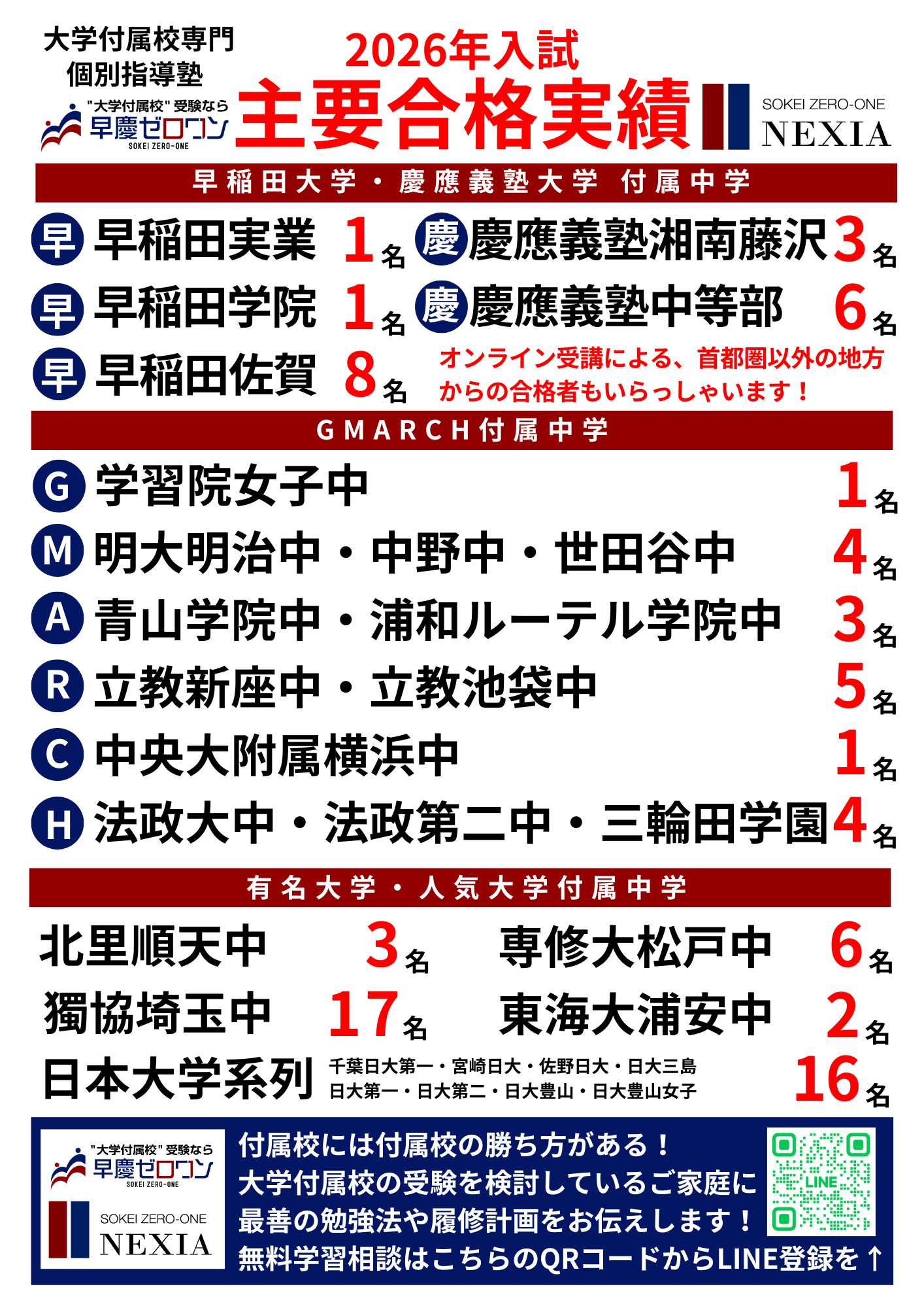 2026年度入試において、早慶ゼロワン・早慶NEXIAでは、早慶・GMARCH付属中学を中心に多数の合格者を輩出しました。