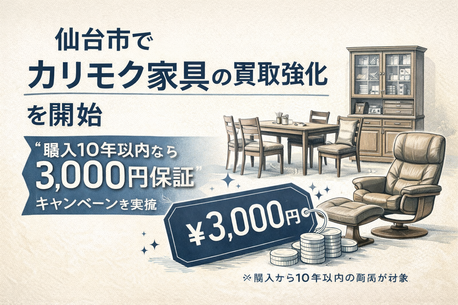 こうした声を受け、当店では**カリモク家具を対象とした買取価格保証キャンペーン(仙台限定)**を開始し、地域の家具リユースをより促進する体制を整えました。