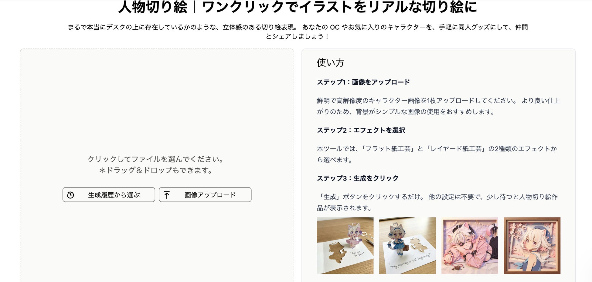 画像をアップロードし生成ボタンを押すだけで、キャラクターイラストを繊細な切り絵作品として自動生成。