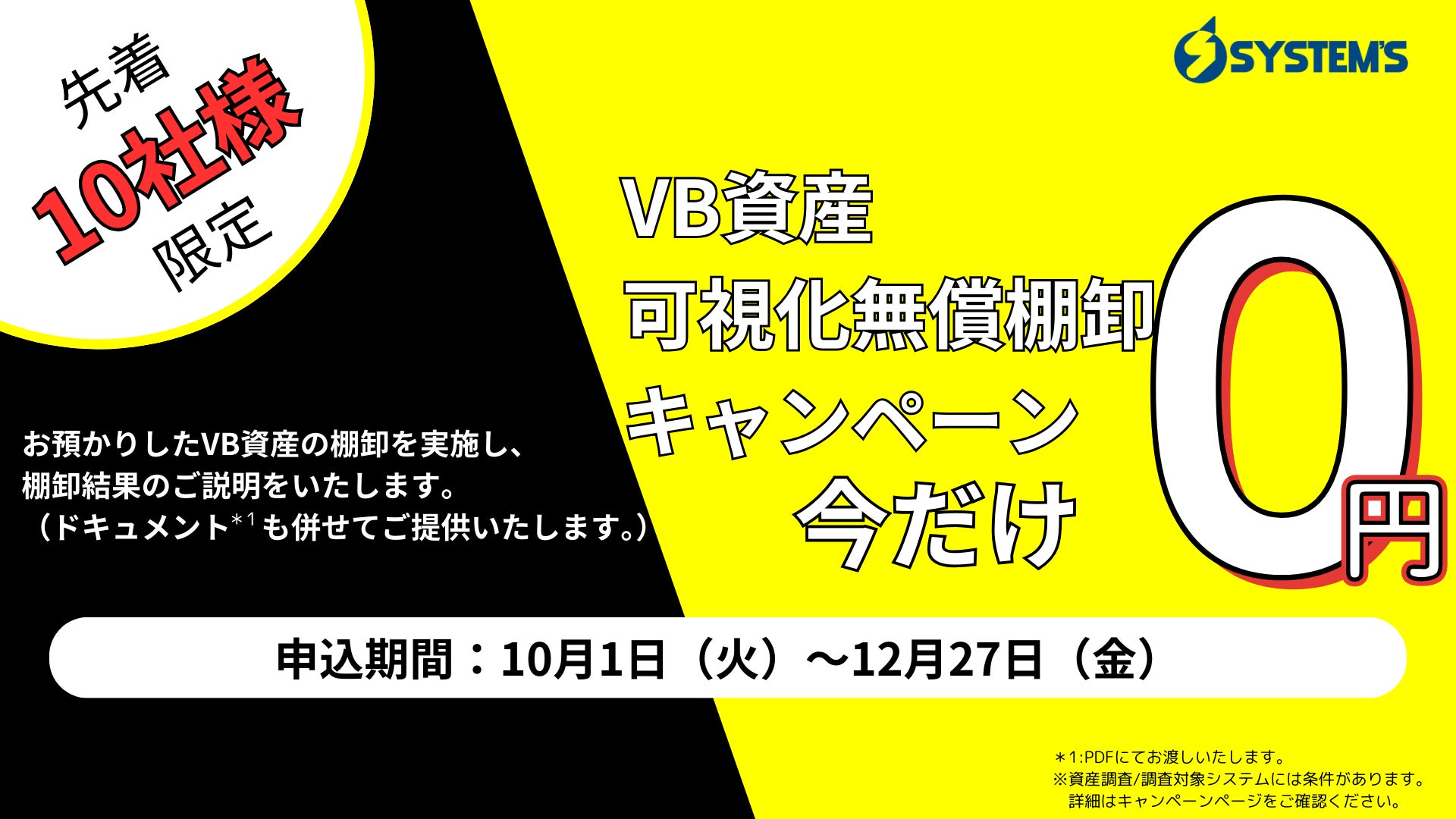キャンペーン期間中、棚卸可能条件を満たしたお申し込みに限り[VBマイグレーション]における、VB資産可視化ドキュメント等を先着順で10社まで、無償でご提供いたします。