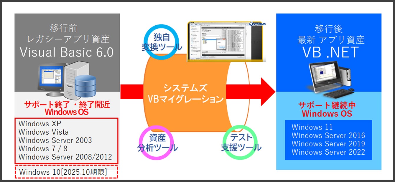マイグレーションプロバイダ システムズでは、DX化を阻害するレガシーシステム脱却の機運の高まりを受け、レガシーシステムの中でも未だ既存システムに多く残存するVB6.0で開発されたアプリシステムに再注目。特に2025年10月にはWindows10の延長サポートも終了することから、今後もVB6.0アプリシステムを使い続けるリスクが高まり延命の道は狭まると考えられます。