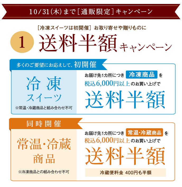 併せて10月31日(木)までの期間、税込6,000円以上お買い上げで通販限定【送料半額キャンペーン】を実施しております。今回は「冷凍スイーツ」の送料半額キャンペーンが初開催。秋のお取り寄せやご贈答などにぜひご利用ください。