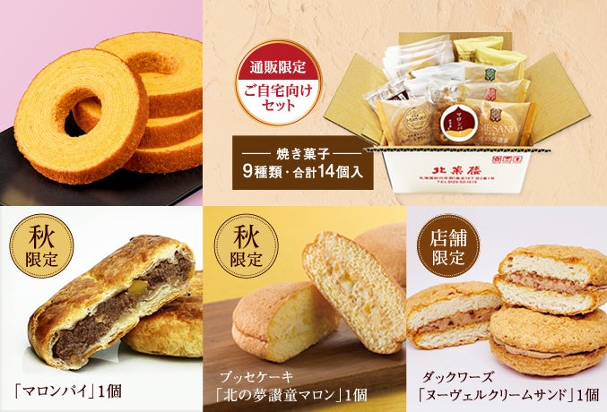 「マロンバウムクーヘン」や「スイートポテトバウムクーヘン」、「北海道開拓おかき8種味くらべセット」、パウンドケーキ「葡萄と小麦」、「焼き菓子バラエティBOX(秋)」など色々な商品を取り揃えました。