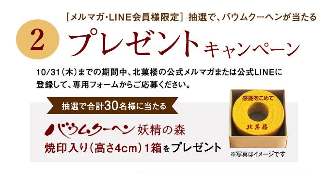 9/17(火)~10/31(木)迄の期間中、北菓楼の「公式メルマガ」または「公式LINEアカウント」へご登録いただき、専用の応募フォームからご応募ください。メルマガとLINEそれぞれご登録いただくと当選確率が2倍にアップします。抽選で30名様に「バウムクーヘン妖精の森 焼印入り(ホール・高さ4cm)」1箱をプレゼントいたします。
