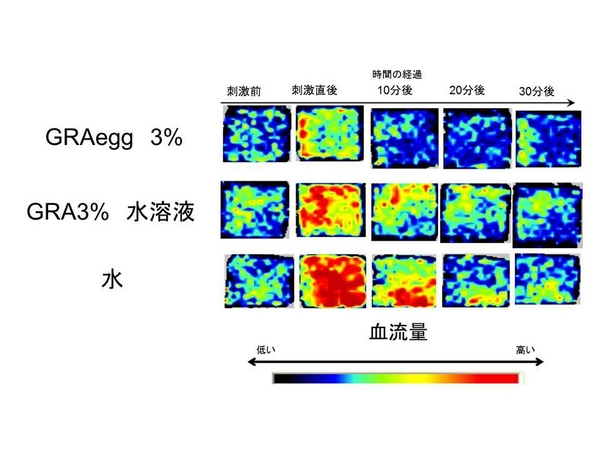 ※写真2:事前に各製剤GRAegg3%水溶液、グリチルレチン酸3%水溶液、水の3種類を前腕外側皮膚(一定面積)に塗布。30分後塗布部の角層剥離を行い皮膚を刺激した。剥離直後から経時ごとの血流量を比較した。赤い色が少ないほど、血流量が少なく抗炎症作用が働いていることを示す。