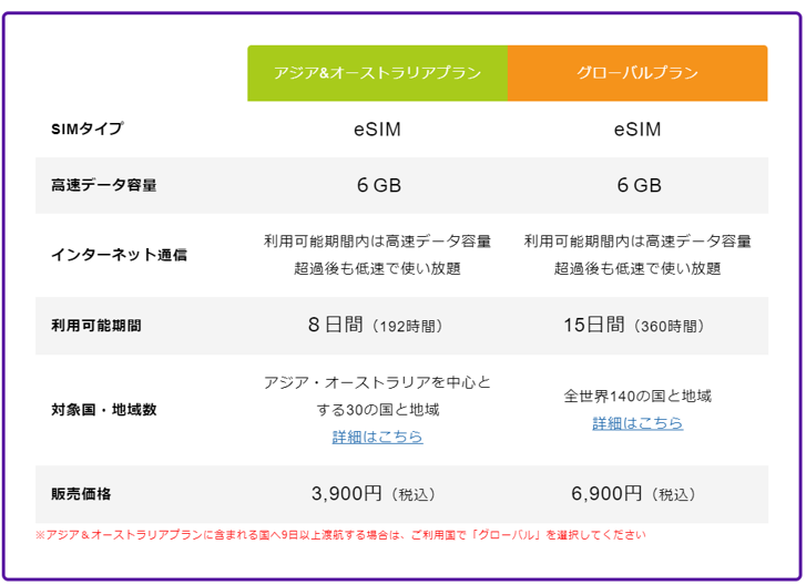 料金設定は事務手数料などの追加費用が一切かからず、契約期間の縛りもありません。「アジア&オーストラリアプラン」・「グローバルプラン」それぞれのエリア内の国を跨いで利用可能で、2カ国以上の周遊でも追加料金なしでご利用いただけます。ギガを使い切った後でも期限内であれば速度制限下でご利用を継続いただけます。