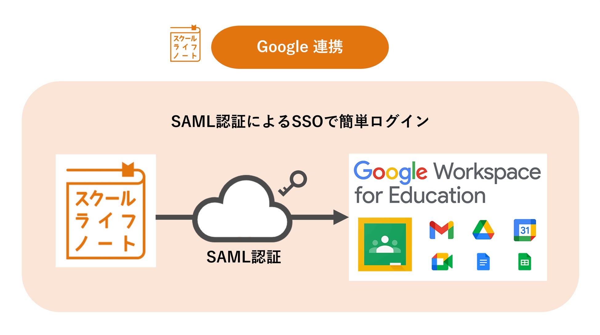 Google Workspace for Education とのSAML認証によるSSOに対応し、ユーザーID・パスワードを入力しなくても各種 Google ツールにログインできるようになります。