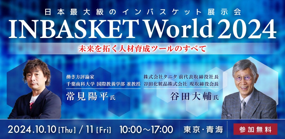 株式会社インバスケット研究所(本社:東京都江東区、代表取締役社長:鳥原隆志)は、2024年10月10日(木)および11日(金)の両日、東京都江東区のタイム24ビルにて、【INBASKET World2024 ~未来を拓く人材育成ツールのすべて~】を開催いたします。