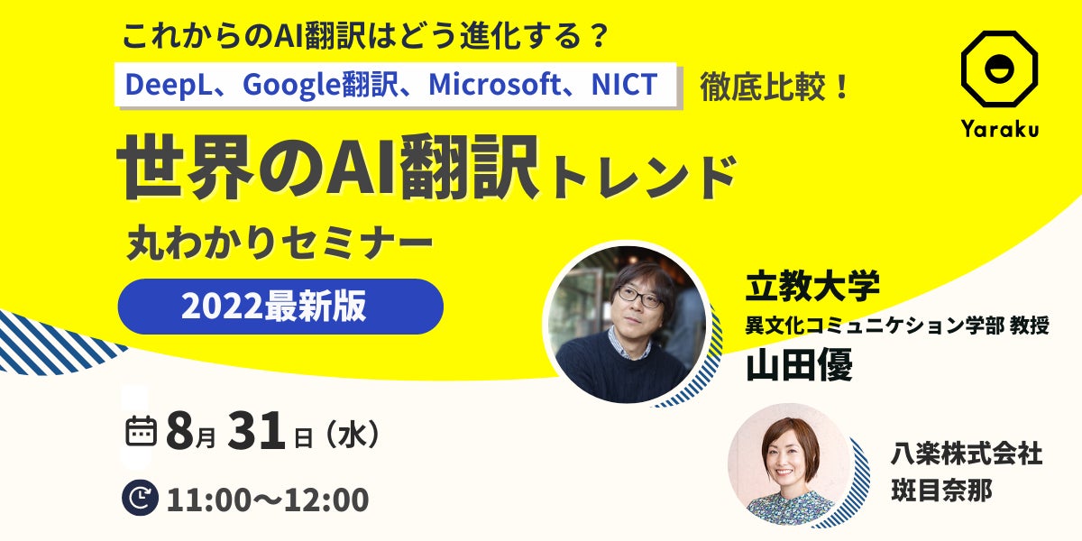 AI+人で生産性を高めるAI自動翻訳プラットフォーム「ヤラクゼン」を提供する八楽株式会社(所在地:東京都渋谷区、代表取締役:坂西優)は、無料オンラインセミナー『2022年最新版・世界のAI翻訳トレンド丸わかりセミナー』を2022年8月31⽇ (水)に開催いたします。