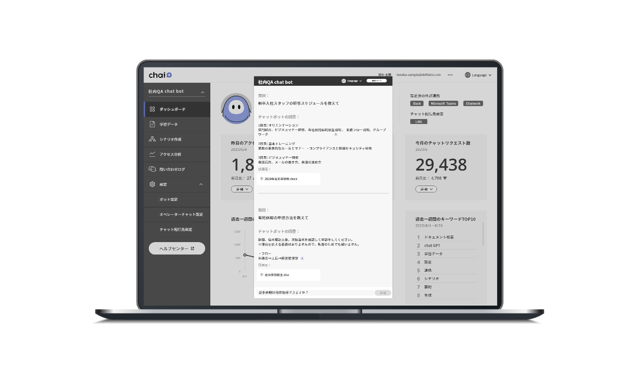 企業の内部にある膨大なドキュメントや情報の中から必要なデータを探し出すのに時間がかかっていませんか?「chai+」は、この課題を解決するために、社内ナレッジを整理し、迅速に情報を提供できる生成AIツールです。営業資料やカスタマーサポート、人事・総務など、各部門に合わせた特化型AIチャットボットで、日々の業務を強力にサポートします。