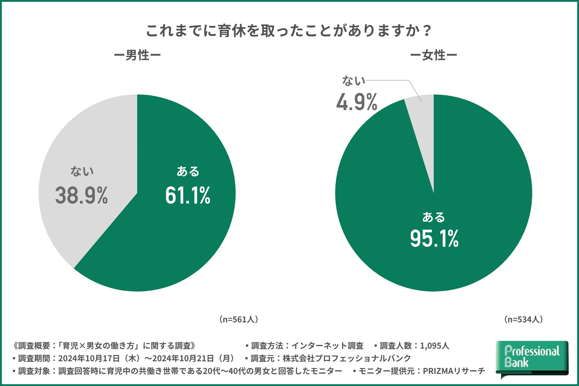 育休取得経験の有無を聞いたところ、6割の男性が『ある(61.1%)』、9割以上の女性が『ある(95.1%)』と回答しました。