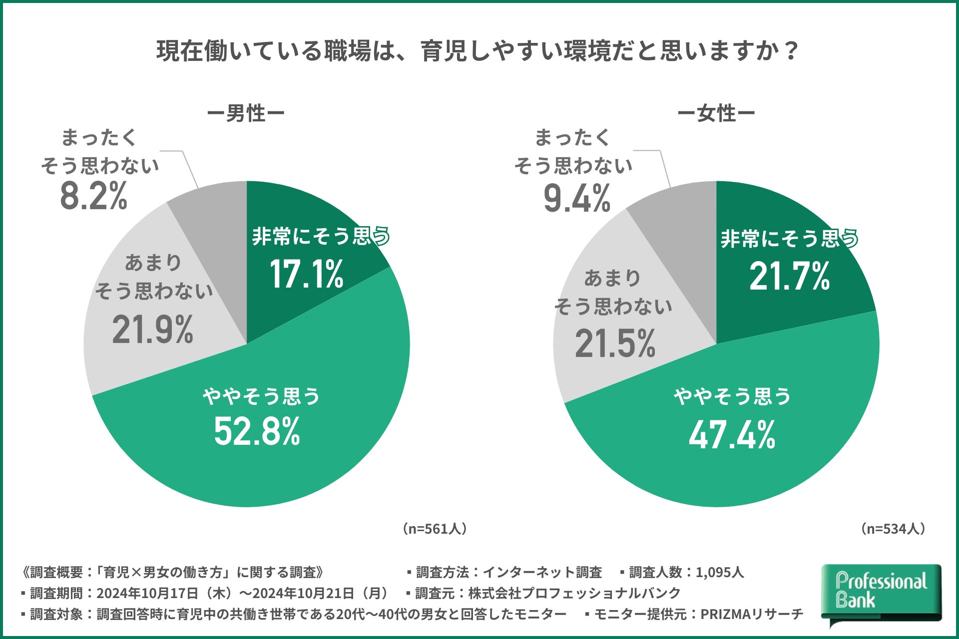 また、女性も『非常にそう思う(21.7%)』『ややそう思う(47.4%)』『あまりそう思わない(21.5%)』『まったくそう思わない(9.4%)』となり、男女ともに現在の職場は育児しやすい環境だと思う方が約7割を占める結果になりました。
