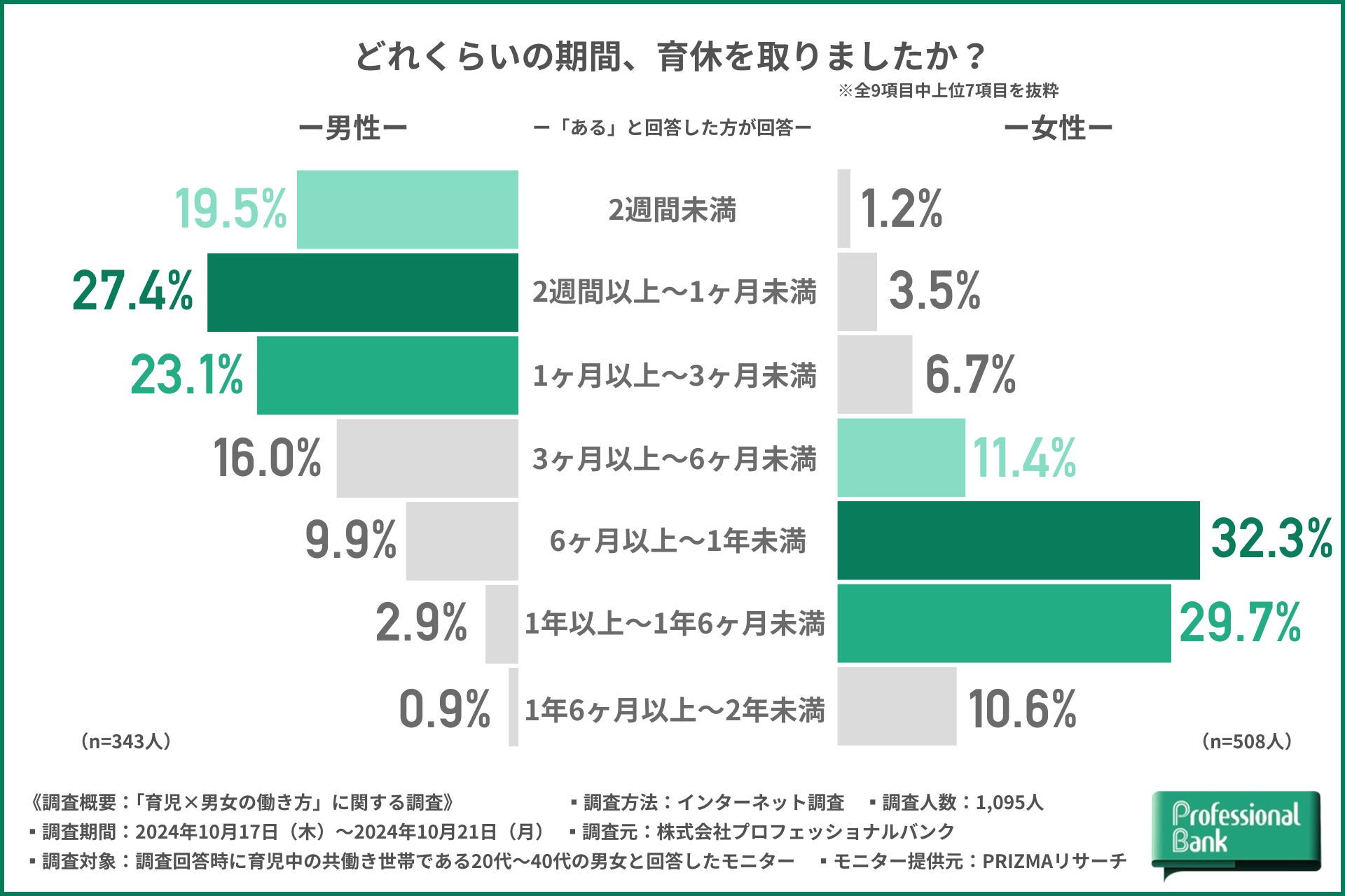 育休を取得した期間を聞いたところ、男性は『2週間以上~1ヶ月未満(27.4%)』が最も多く、『1ヶ月以上~3ヶ月未満(23.1%)』『2週間未満(19.5%)』と続きました。