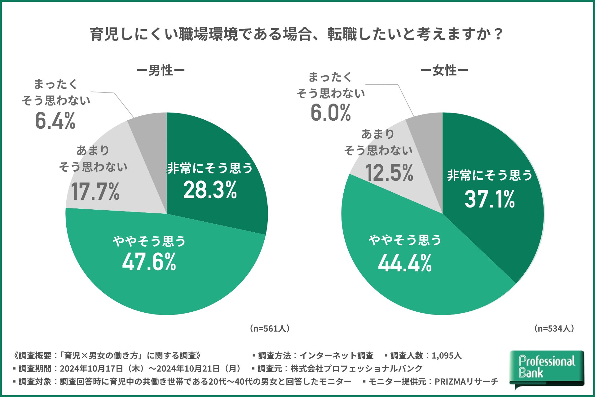育児しにくい職場環境である場合、男性は7割以上、女性は8割以上が「転職を考える」という結果に