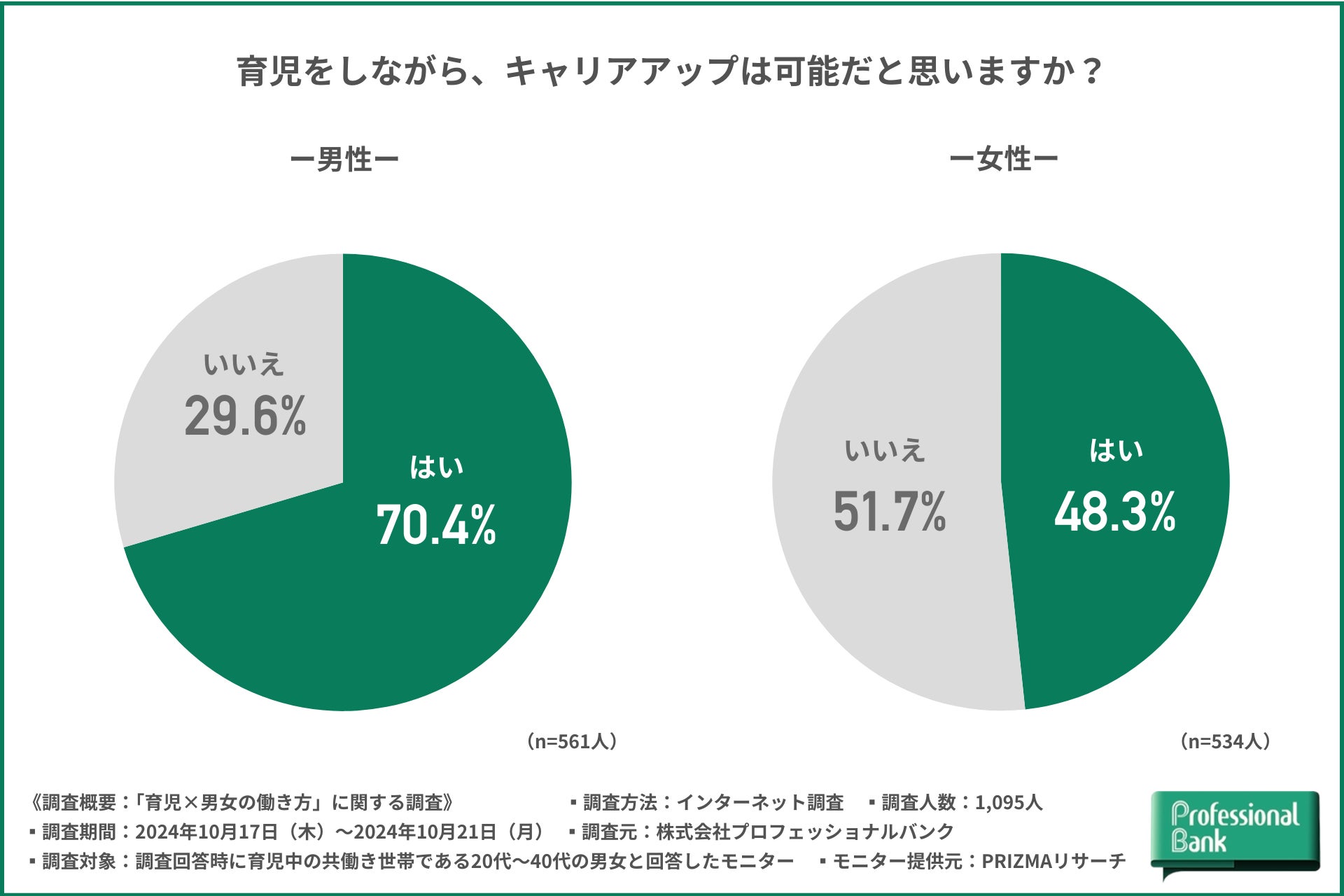 また、育児をしながら、キャリアアップは可能だと思うか聞いたところ、男性の約7割が『はい(70.4%)』と回答した一方で、女性は『いいえ(51.7%)』が半数以上になりました。男性の方が育児とキャリアの両立に対して楽観的に考えている様子がうかがえました。