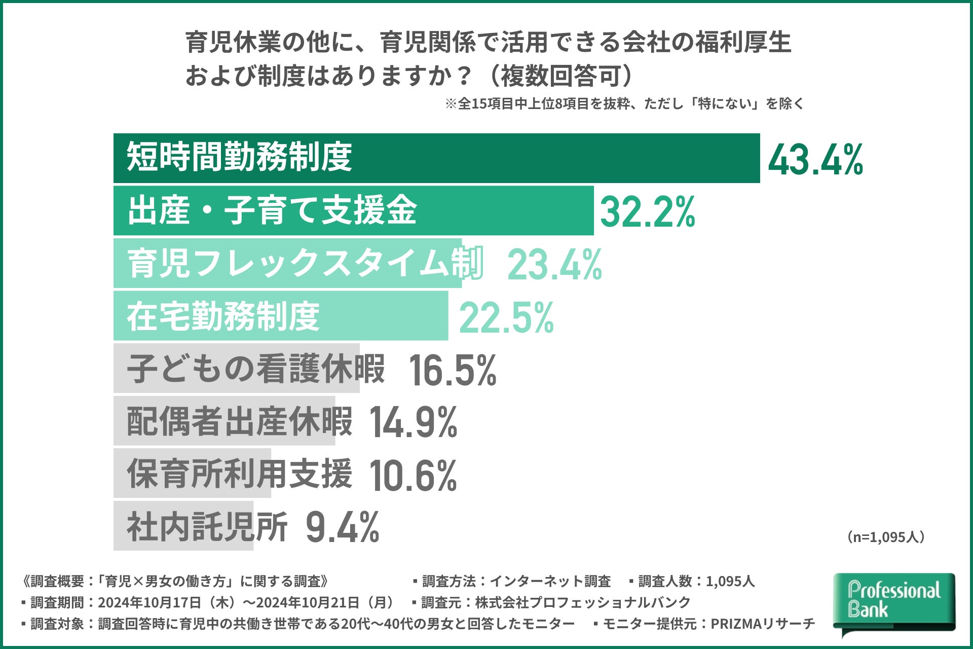 育児休業の他に、育児関係で活用できる会社の福利厚生および制度の有無について質問したところ、『短時間勤務制度(43.4%)』が最も多く、次いで『出産・子育て支援金(32.2%)』『育児フレックスタイム制(23.4%)』『在宅勤務制度(22.5%)』と続きました。