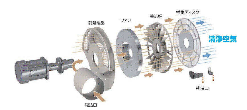 セルフドレン式(陽圧排油)採用により、捕集ディスクの目詰まりが低減しました。ファンと整流板の後段に捕集ディスクを配置することにより、吸引風量低下の原因となる捕集ディスクの目詰まりが抑制されます。