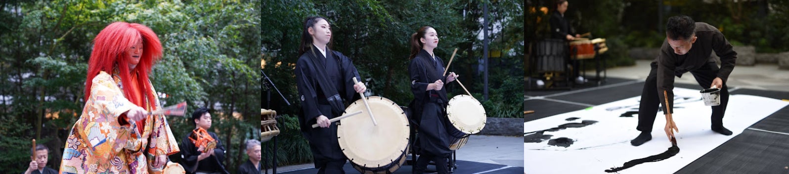 和太鼓演奏(宮本卯之助商店プロデュース。田村優、見目萌 )/ライブ書道(葵雋卿)/呈茶(新山宗與)/Neo民謡(久嶋美さち)/有名DJによるライブステージ(沖野修也・ Masaki Tamura・DJ Mao F・DJ Tak Umezawa・EMO・OKUI JUN)/フリースタイルフットボール パフォーマンス(LA CLASSIC)