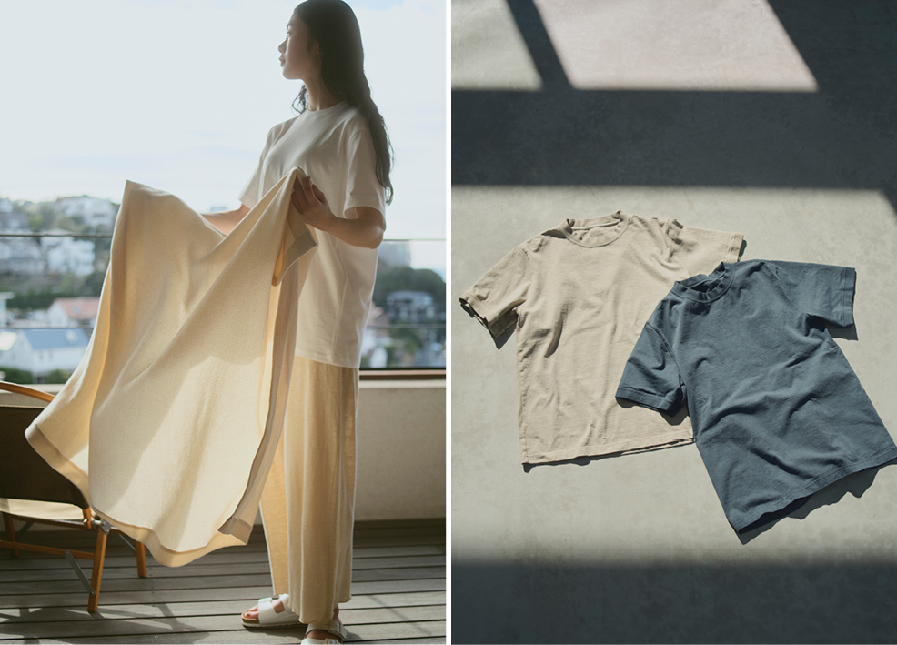 遠くに出かけて得る刺激はもちろん大きな楽しみですが、ふと庭の木々を眺めて気持ちがほどける瞬間、水道から流れる冷たい水が温かくなり身体が緩まるとき、散歩の途中で感じる陽のあたたかさや、肌に触れる空気の気配。毎日の生活の中に見い出す、そんなちょっとした気づきや変化を「日常の旅」として捉え、そんな瞬間に寄り添う素材を選びました。