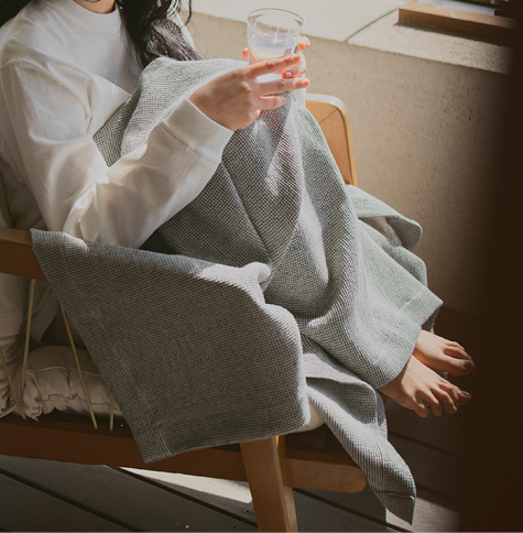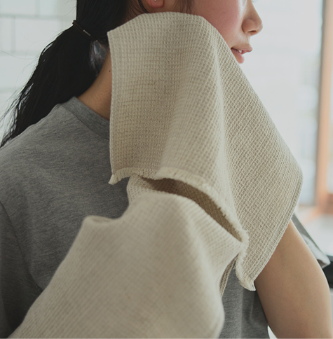 オーガニックコットンの柔らかさと吸水性、リネンの速乾性と耐久性を兼ね備えたワッフルクロス。滋賀県・琵琶湖の東、湖東地域は、室町時代から続く麻織物の産地。その伝統を受け継ぎながら、丁寧に織り上げました。サイズは、ハンドタオル、フェイスタオル、バスタオル、そして膝掛けとしても使えるハーフケットの4種展開。肌に直接触れるものだからこそ、素材と使い心地にこだわったアイテムです。