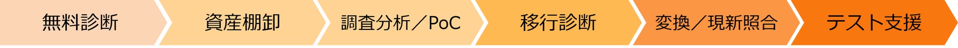 また、オープンシステム環境への移行フローは、無料診断、資産棚卸、調査分析/PoC、移行診断、変換/現新照合、テスト支援の順で行います。