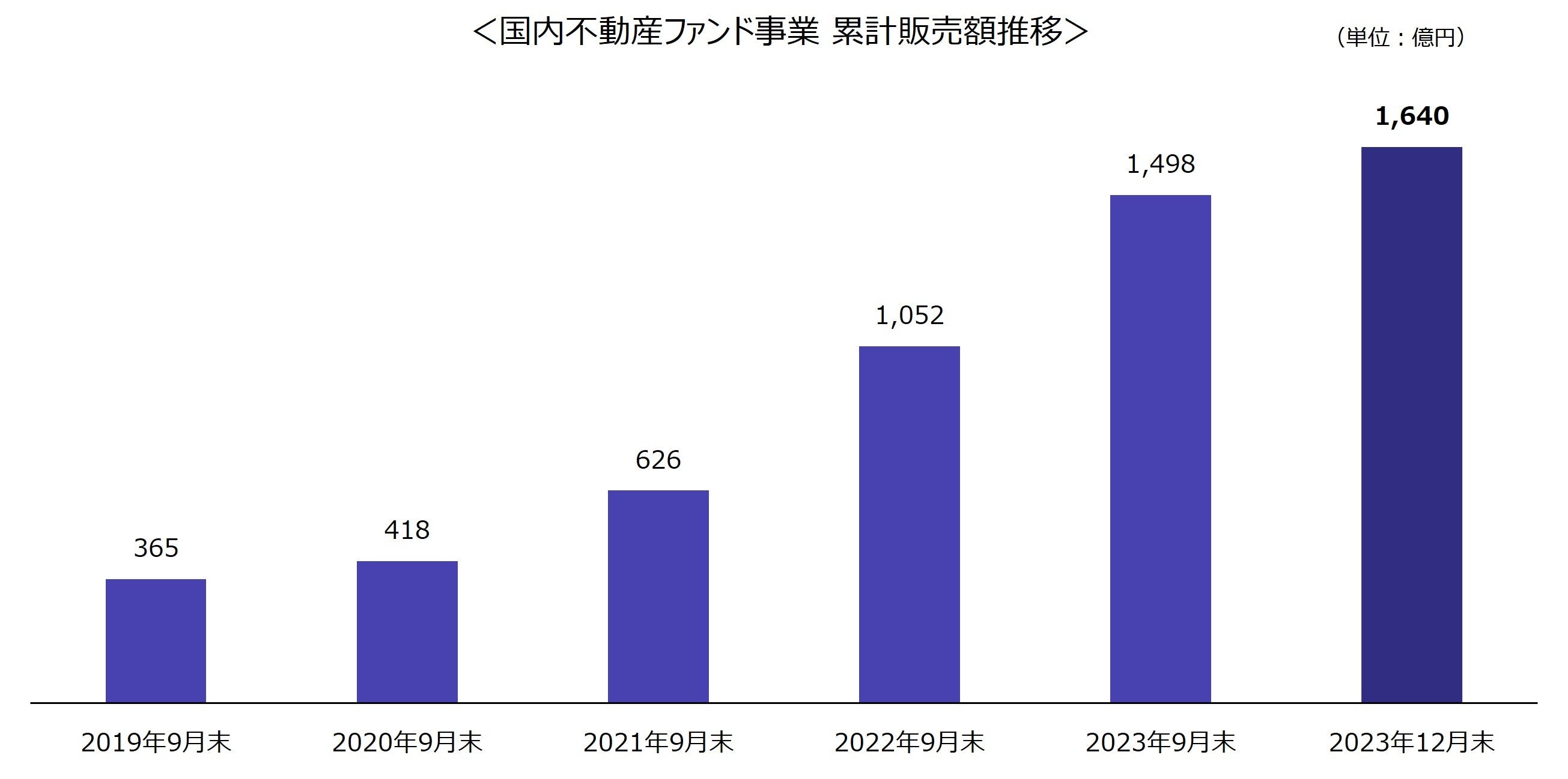 お客様からの旺盛な需要に応えるため、都心一等地の不動産を積極的に取得し、組成と販売の好循環を確立させた結果、2023年9月期の販売額が445億円超となり、3期連続で過去最高販売額を更新いたしました。また2023年12月には、過去最大の大規模案件である「FPGリンクス渋谷道玄坂※」が好評のうちに完売となるなど好調な販売が継続しており、2023年12月末時点で国内不動産ファンド事業の累計販売額が1,600億円を突破いたしました。
