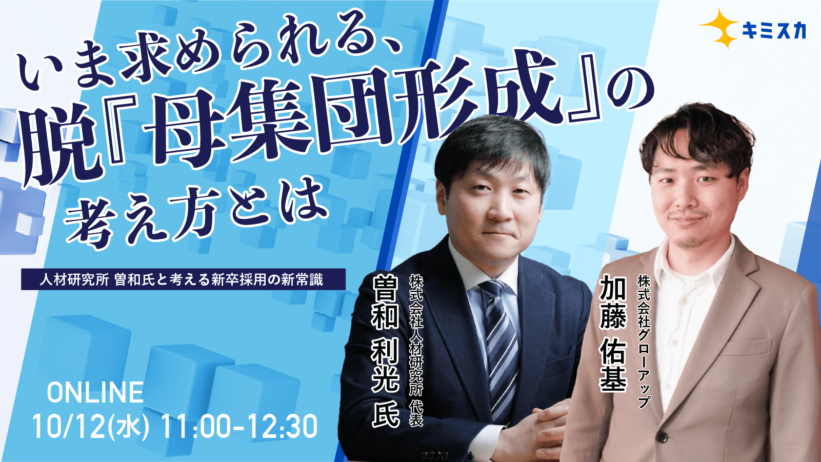 株式会社グローアップ(本社:東京都港区、代表取締役:鈴村 賢治)が運営する新卒向けダイレクトリクルーティングサービス「キミスカ」は、10月12日(水)に株式会社人材研究所、曽和利光氏をお招きして、企業向け新卒採用セミナーを開催することをお知らせいたします。新卒採用において、多くの採用担当が課題にしている『母集団形成』についてお話いたします。