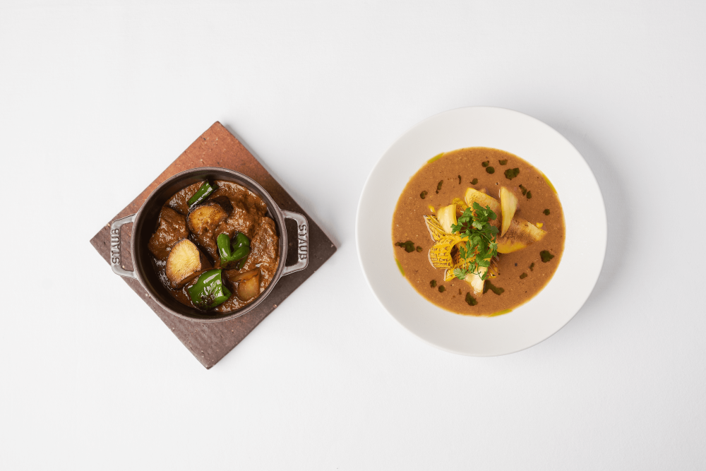 茨城県ゆかりのシェフら4人が月替わりで創作カレーの商品をリリース。第二弾は「常陸の輝きとピーマン、サツマイモのスパイスカレー」「常磐沖ヤリイカと白菜のスープカレー サフラン風味」を販売。