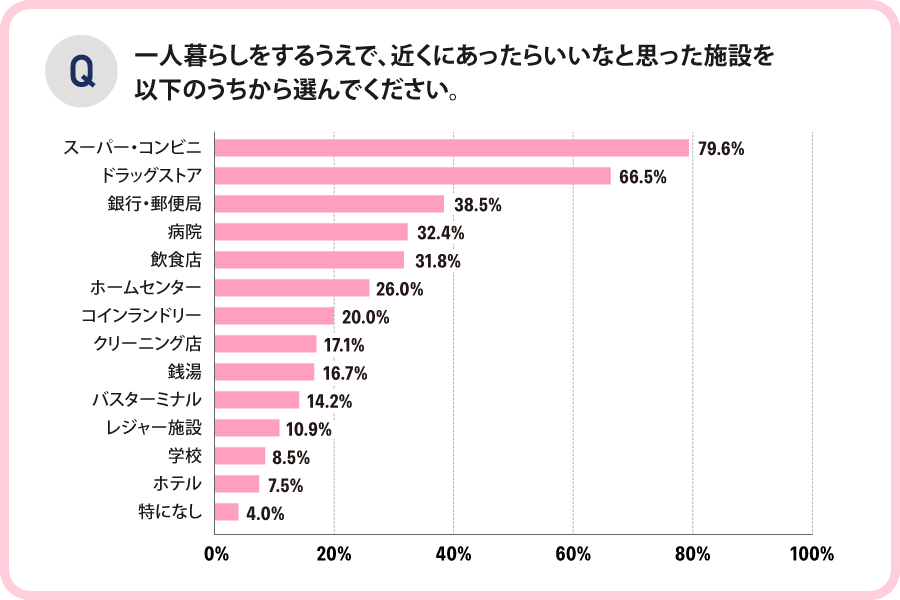 まずは、「一人暮らしで近くにあったらいいなと思う施設」についてアンケート調査しました。