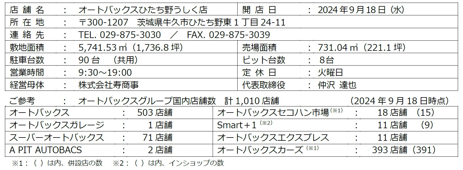 株式会社オートバックスセブン(代表取締役 社長:堀井勇吾)と加盟店契約を結んでいる株式会社寿商事(代表取締役:仲沢達也)は、2024年9月18日(水)に「オートバックスひたち野うしく店」を新規オープンいたします。