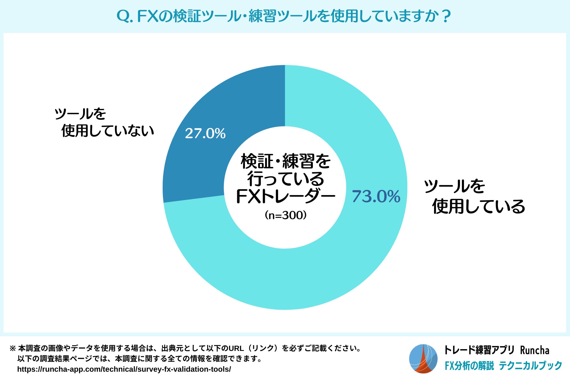 FXの検証・練習における専用ツールの使用状況を調査したところ、73.0%がツールを使用しているという結果になりました。検証・練習を行う際には、専用ツールを使用するのが主流といえそうです。