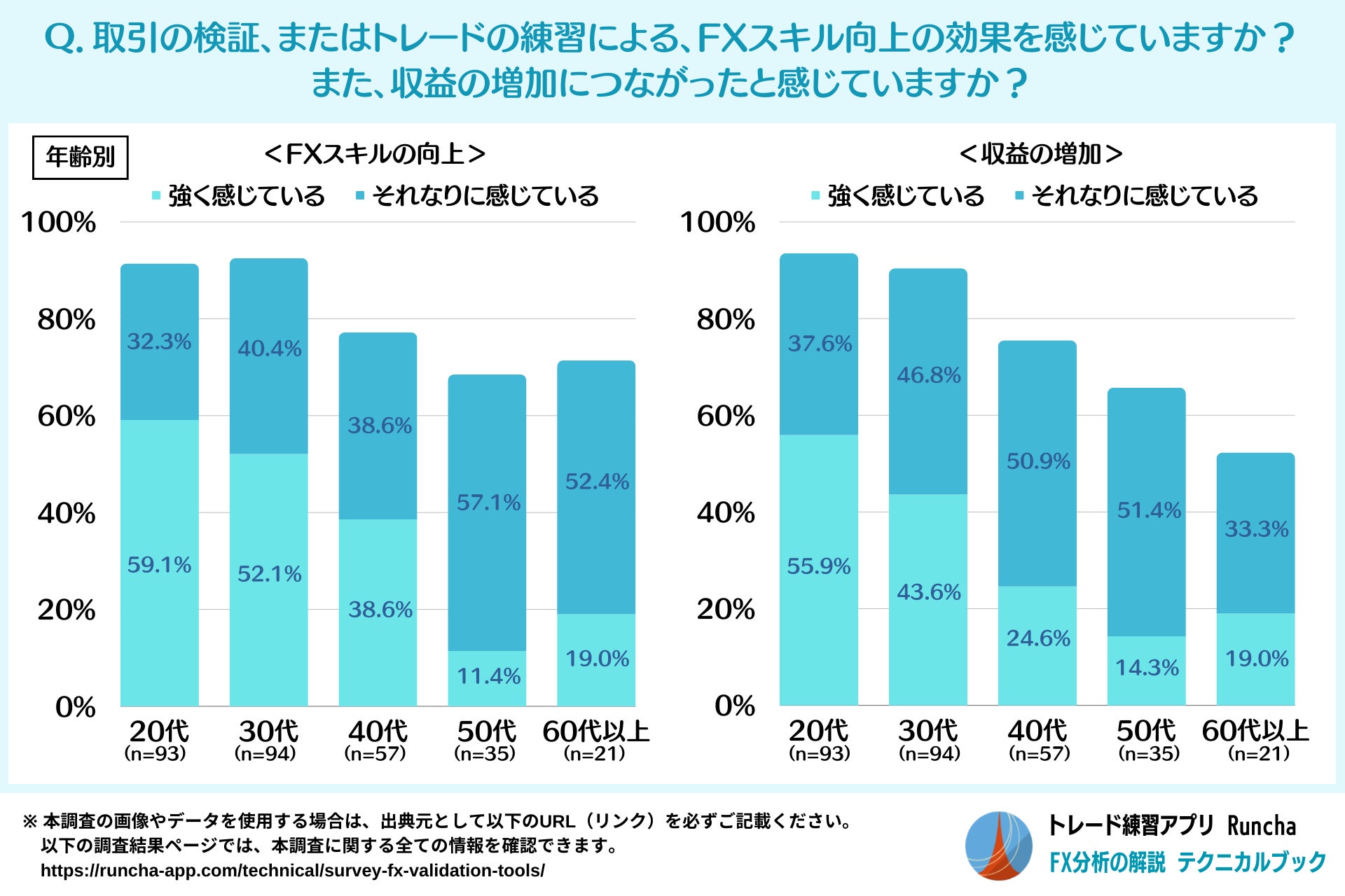 8割以上が検証・練習によってスキル向上や収益増加を感じており、20代・30代では9割を超える