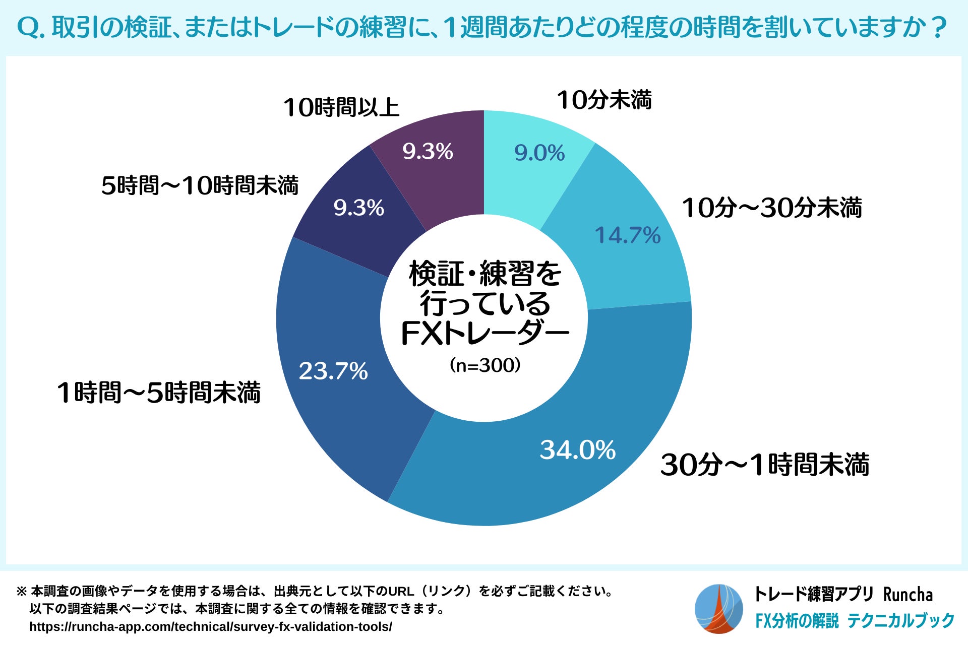 82.6%のFXトレーダーが検証・練習に取り組んでおり、週あたり1時間前後の時間を割く人が多い