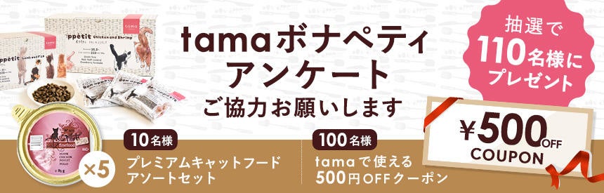 プレミアムキャットフード専門店・通販「たまのおねだり(tama)」(運営:マーケティングパートナー株式会社、本社所在地:東京都墨田区、代表取締役社長:権田真司、Tel:03-6284-1761)は、ご回答いただいた中から抽選で110名様にプレゼントが当たるアンケート企画を、2022年1月7日より開始しました。(アンケート回答期限:2022年2月13日(日)23時59分まで。当選者は2022年2月22日(火)にtamaサイトにて発表予定。)