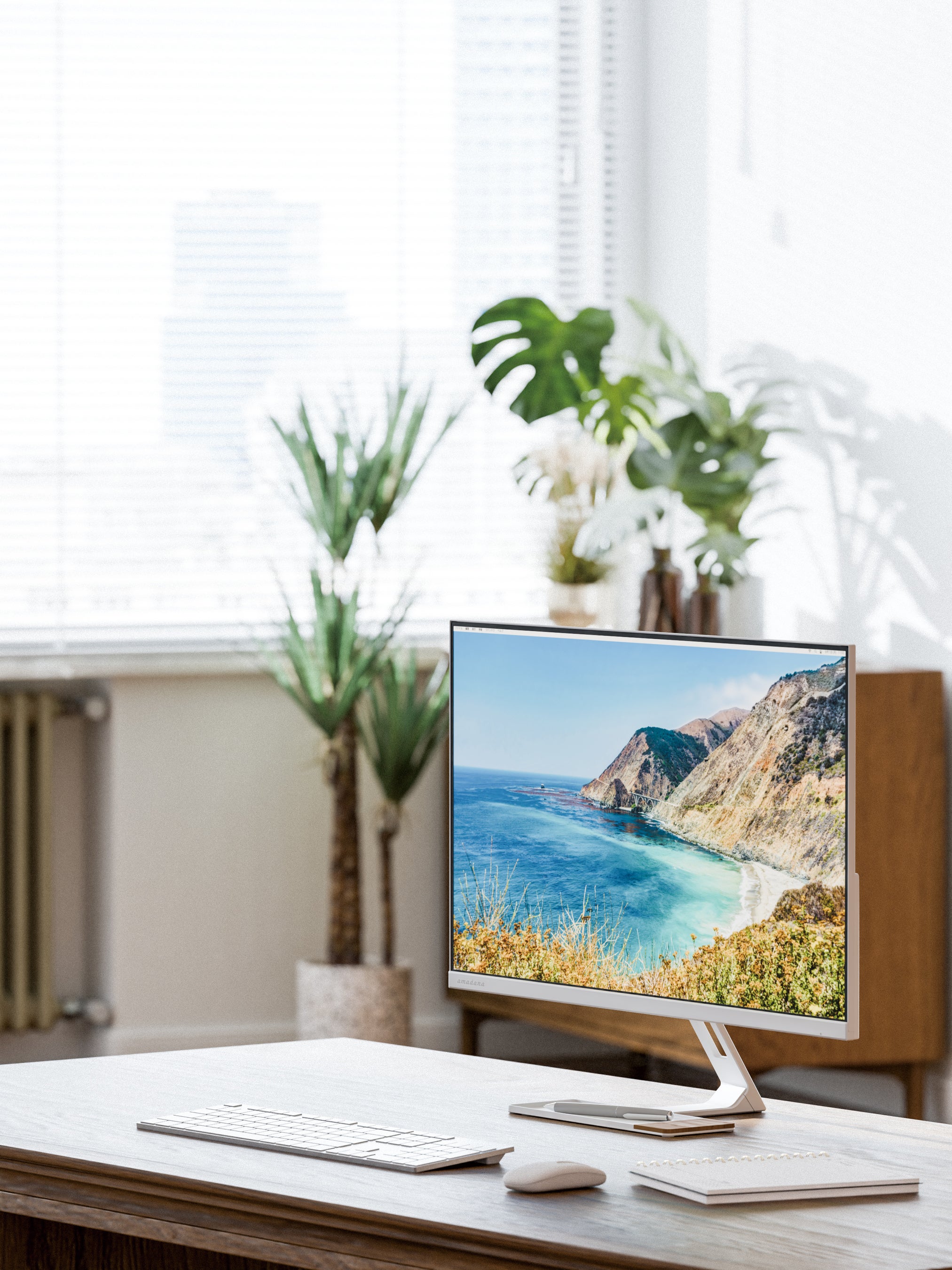 「DS10」「DS20」は、23.8インチまたは27インチのフルHD(1920 × 1080)IPSパネルを搭載した、日常に自然に溶け込むシンプルかつ上質なディスプレイです。映り込みを抑えた非光沢パネルにより、長時間の作業でも目に優しく、100,000,000:1 の高いコントラスト比によって、写真や映像、テキストなどをクリアに表示します。