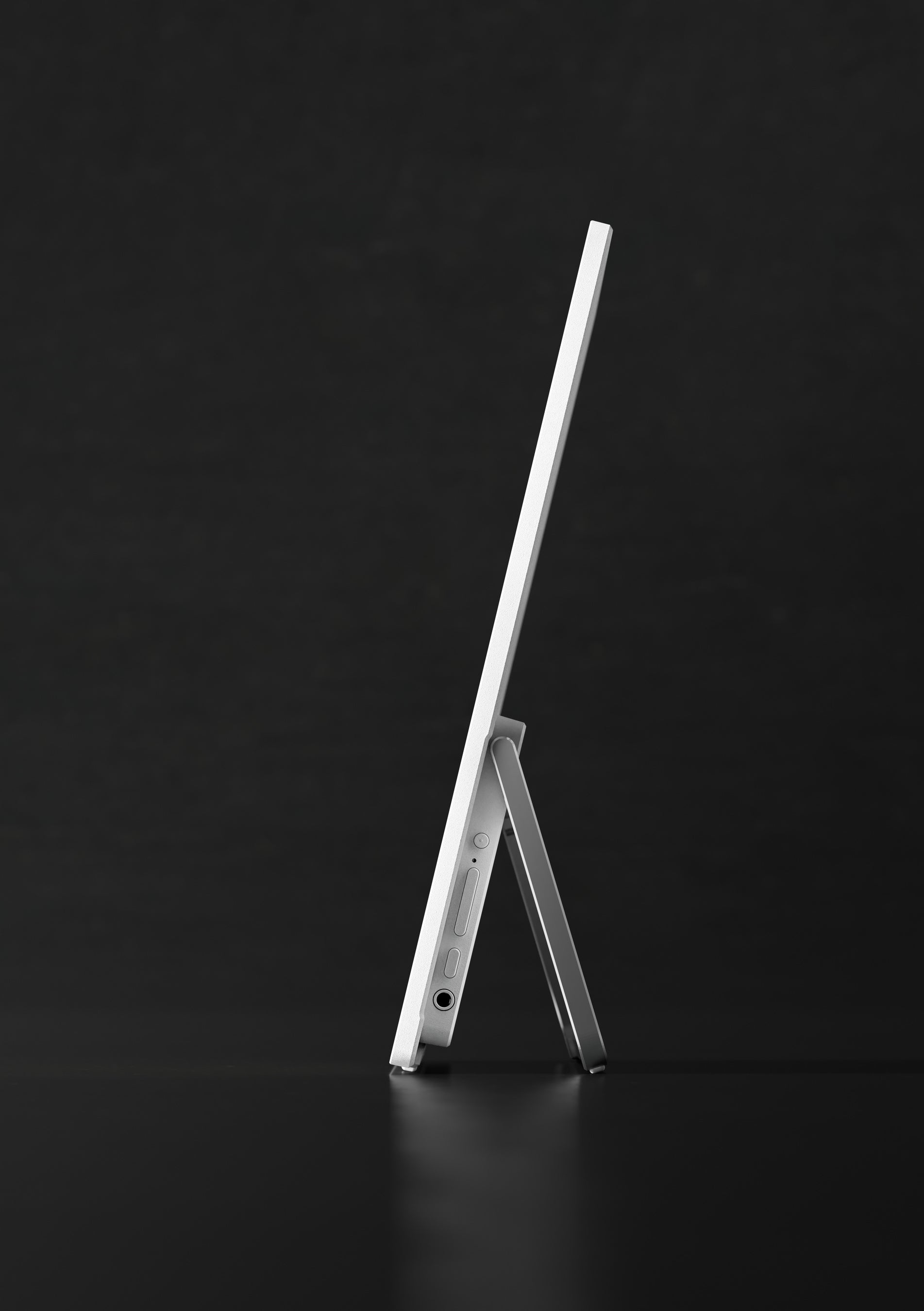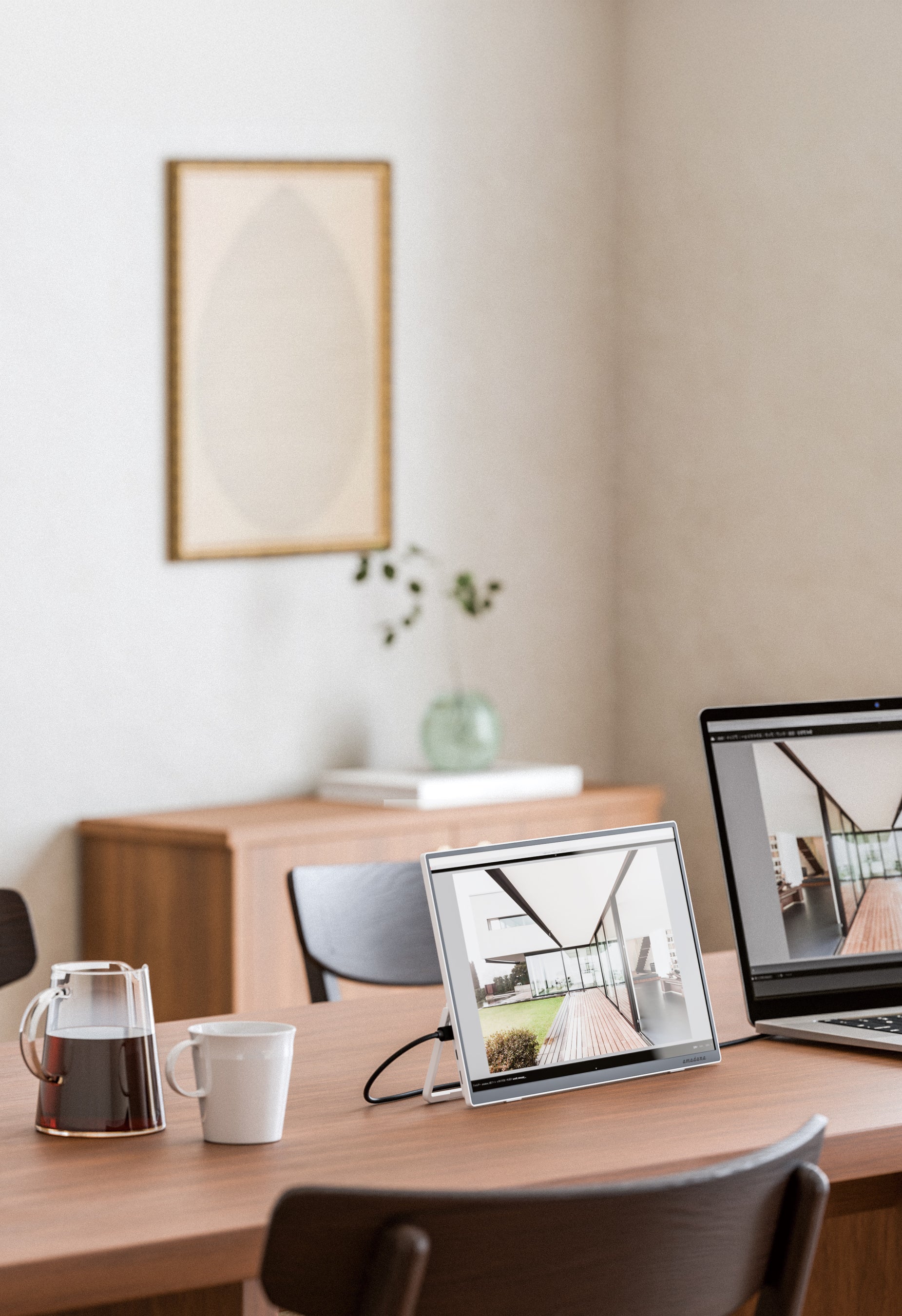 薄く、軽く、どこに置いても馴染むミニマルデザインは、amadanaが大切にしてきた“生活に溶け込む美しさ”を踏襲しつつ、ユーザーの働き方・暮らし方に寄り添うポータブルディスプレイとして仕上げています。