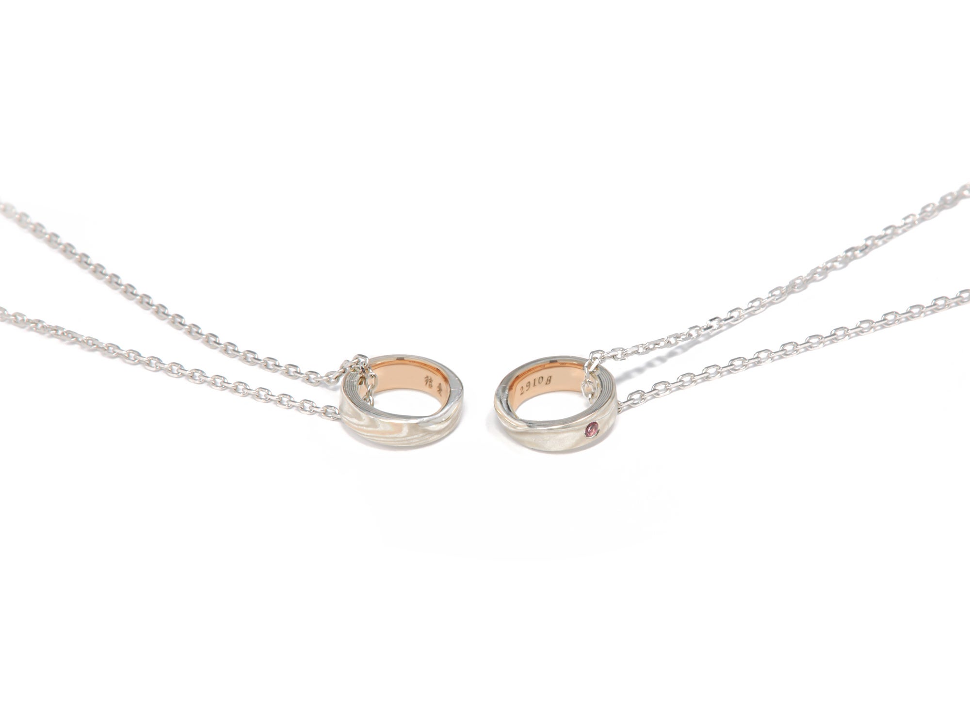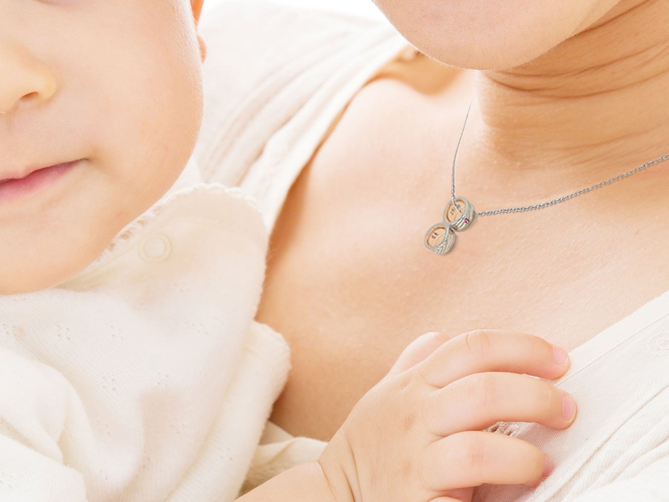 家族の絆を深めるための体験型ジュエリー。赤ちゃんの誕生日を刻んだペンダントヘッドは、将来、親子の手で割って2つのペンダントに分けて使うことができます。このペンダントのフォルムは、親の結婚指輪がつながった状態のミニチュアデザインです。親の結婚指輪のコンセプトは、1つの指輪を自分たちの手で割って2つの指輪を作るという体験を通して、夫婦の絆を深めることです。親と同じ体験を子どもにさせるこのジュエリーは、家族の深い絆を象徴するのにぴったりです。