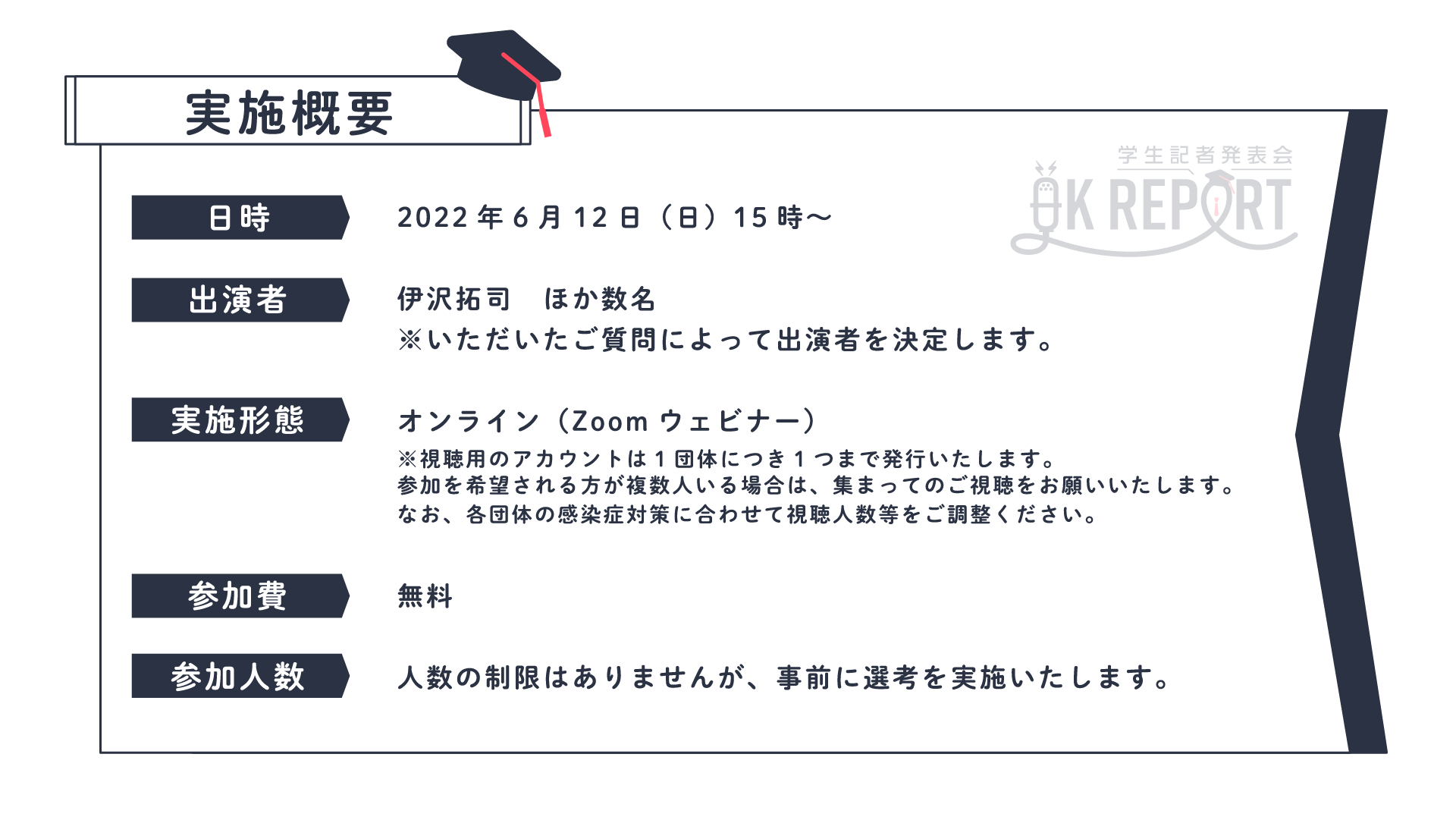 株式会社baton(東京都品川区、代表 衣川洋佑)が運営するQuizKnockは、「QK REPORT」を実施します。「QK REPORT」とはQuizKnockがオンラインで記者発表会を開催し、全国の学生記者の取材に答えるプロジェクトです。開催は6月12日(日)を予定しており、応募締め切りは5月15日(日)までです。