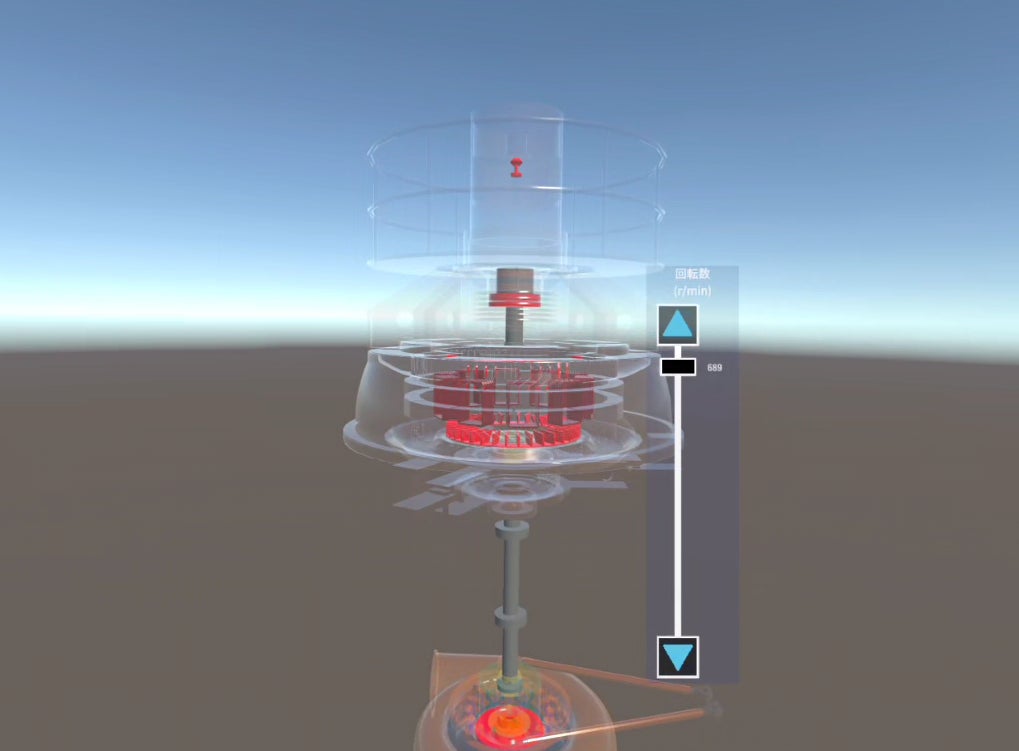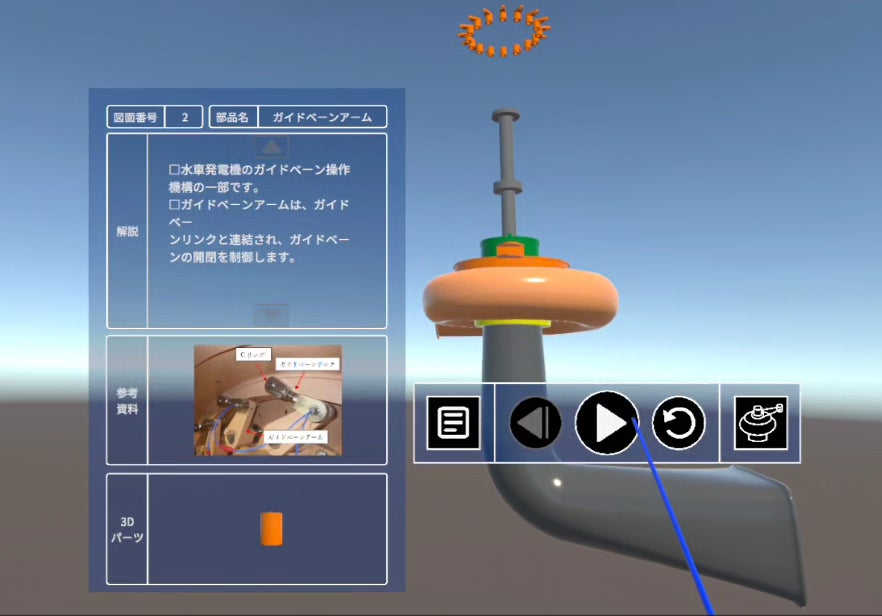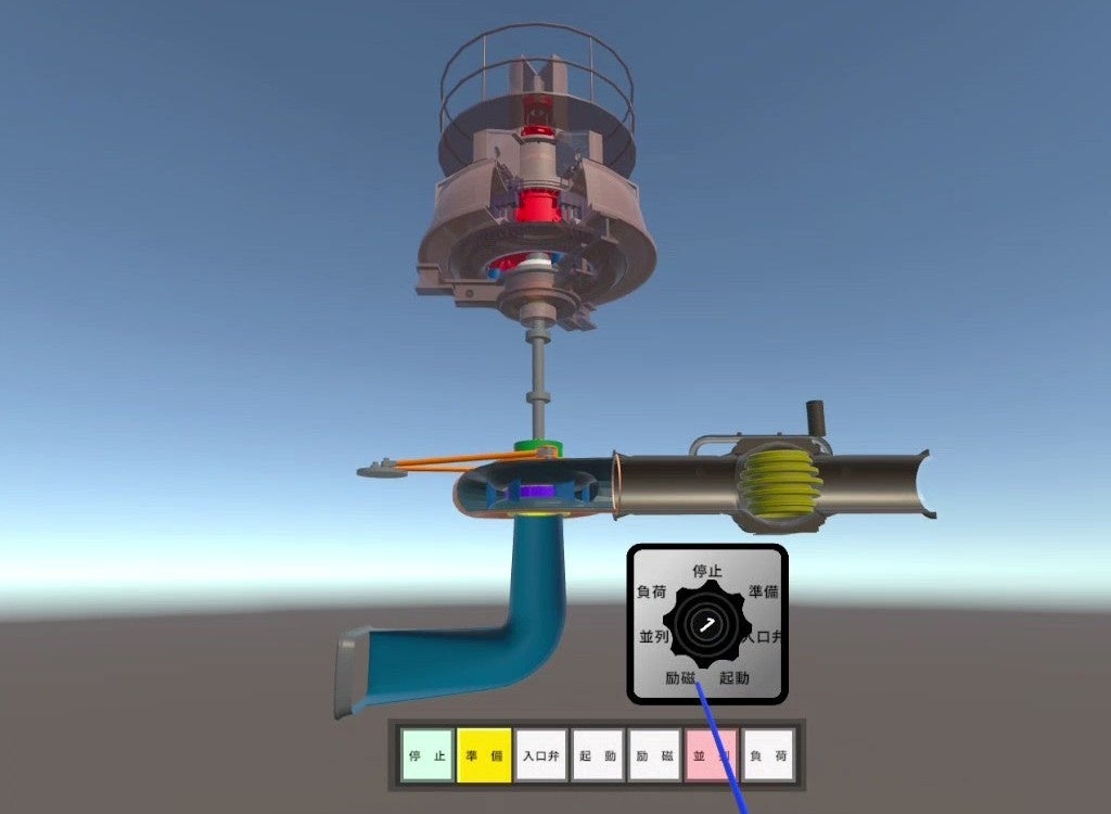 水車発電機の分解工程を段階的に再現することで、実際の作業を仮想空間上で体験できます。