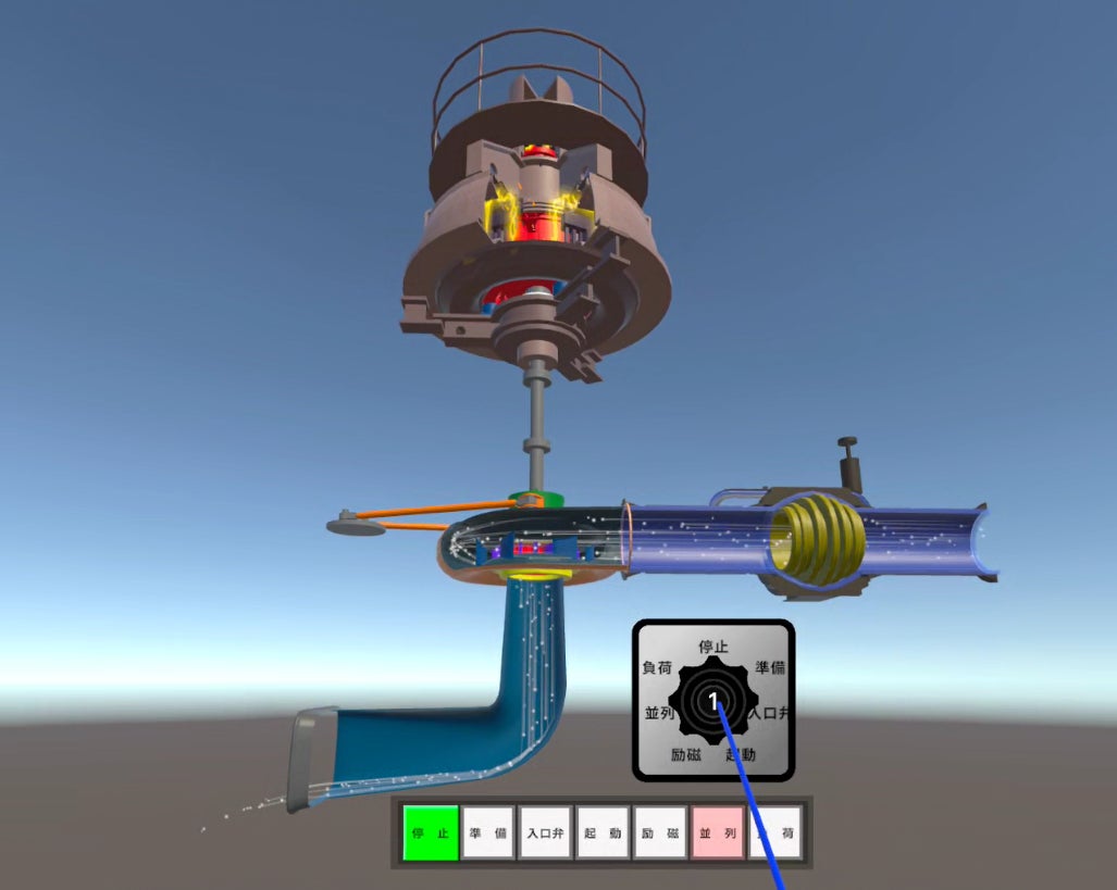 水の流入からバルブの開放、水車の回転、そして発電の開始に至るまでの一連の動作を、アニメーションによって再現しています。
