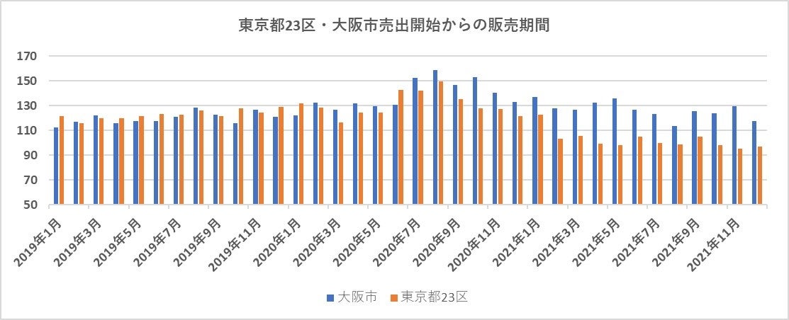 上記グラフは、東京都23区(オレンジ)と大阪市(青)の各月ごとに販売が完了した中古マンションの売出開始から販売完了までの経過日数の平均値を表しています。この期間が短いほど物件がすぐに売れるということを示しており、需要が高いと判断できます。