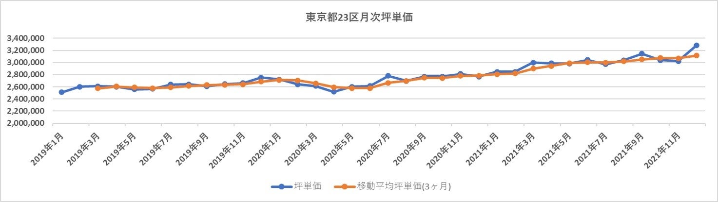 坪単価は、1度目の緊急事態宣言が出た2020年4月に一時的に下がりましたが、2020年後半から高騰基調に。2021年からはさらに加速しています。